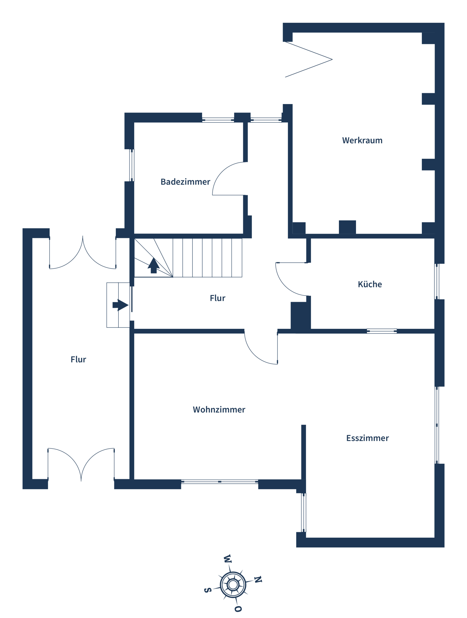 Im Erdgeschoss erwartet Sie ein klassischer Grundriss mit großzügigem Wohn-/ Esszimmer und einer Küche, die durch ihre Einbauküche und eine praktische Durchreiche überzeugt. Der Werkraum eignet sich perfekt für alle, die Platz für Hobbys oder Stauraum schätzen. Das Badezimmer mit Tageslicht und Dusche ergänzt diese Ebene.